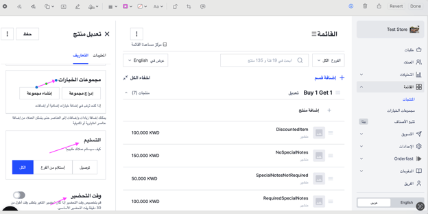 إذا كان المتجر متكامل مع Foodics، أي تعديل على القائمة مثل اسم المنتج، السعر، الخيارات أو مجموعة الاختيارات يجب أن يتم مباشرة من خلال لوحة تحكم Foodics.