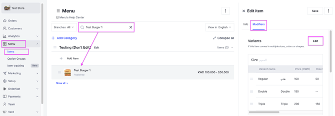 If your store is integrated with Foodics, any edits to the menu—such as item names, prices, option groups, or modifiers—must be done directly through the Foodics dashboard.