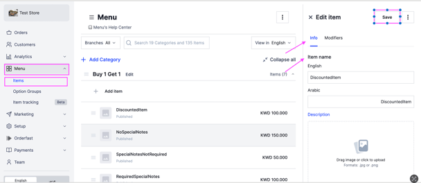 3- In the info section, update the item name in English and Arabic.
