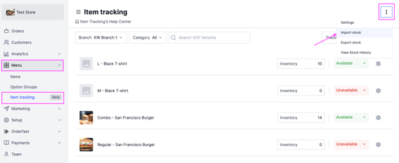 2- Click the options icon at the top right and select Import Stock.