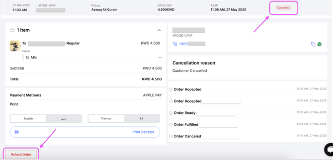 The amount is refunded instantly to the customer’s Orderfast Wallet.