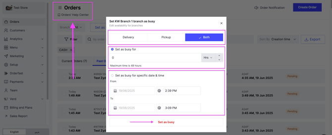 Set Store as Busy from the Orders Tab